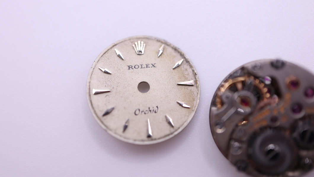 Condition - Used but in good condition, not working but balance seems intact. Missing hour wheel, non signed crown. Includes Orchid Dial.